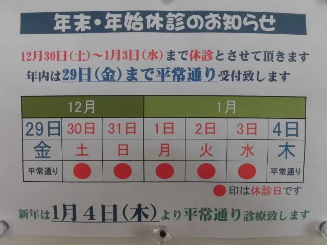 当院年内は明日、29日(金)まで午前午後ともに平常通り受付しております。