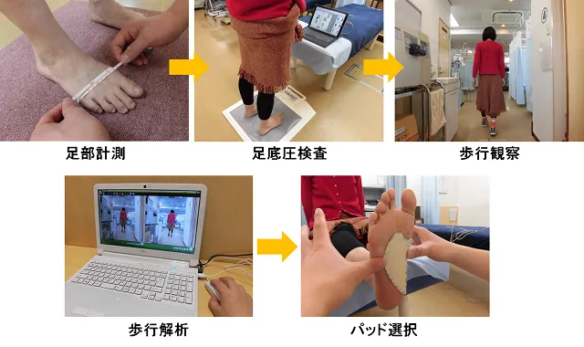 ご利用者様一人一人の足に合わせた中敷(インソール)を靴底に入れ、崩れた歩行バランスを改善することにより、普段あわない靴のせいで発生する足の痛みはもちろん、崩れた歩行バランスが原因で生じている腰痛や体の不調も、改善できるという優れた施術法です。